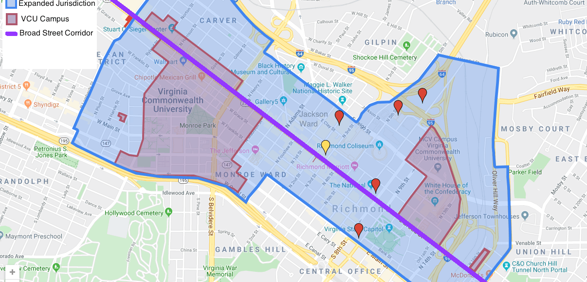 Map showing the substantial expansion of the VCU Police Department’s jurisdiction along the Broad Street Corridor.