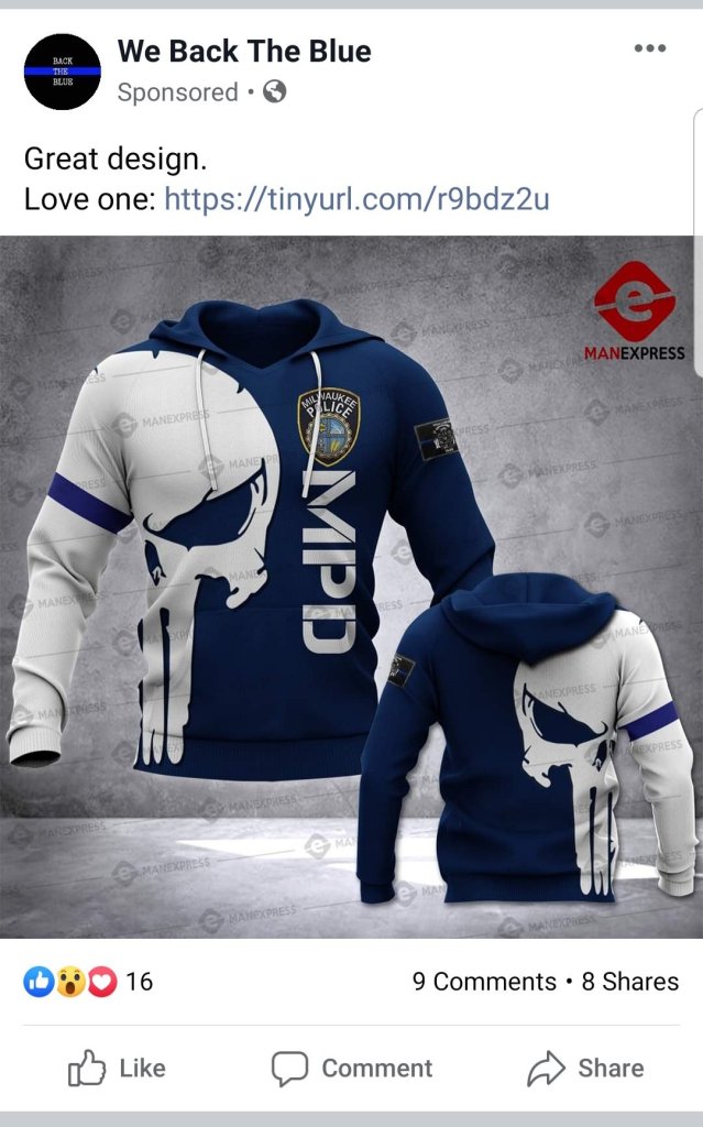 This fantasy of dispensing “justice” without the hindrance of the justice system is concerning considering the rates of police brutality in the United States. In addition to the above-mentioned investigation into the St. Louis police, it was revealed in 2011 that a group of “rogue” officers who called themselves the Punishers had been operating in the Milwaukee Police Department as far back as the October 24, 2004 beating of Frank Jude Jr by off-duty police officers. This group “wore black gloves and caps embossed with skull emblems while on patrol” and at least one alleged member had a Punisher tattoo. Despite this troubling history with the symbol, the merchandise was still being advertised by the “We Back the Blue” Facebook page with the Milwaukee Police emblem and the Thin Blue Line Punisher skull.